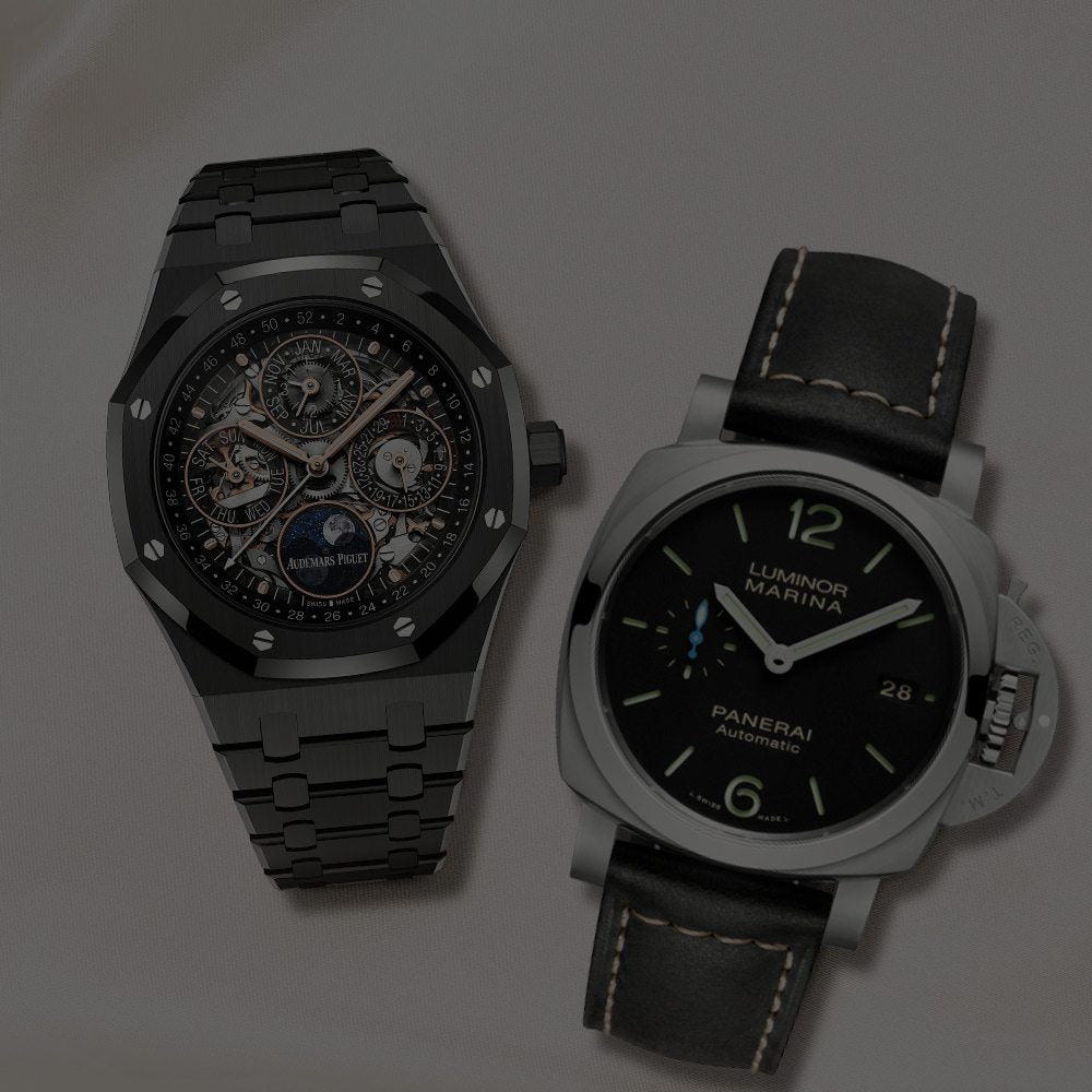 45mm patina steel case, sapphire crystal back, patina steel bezel, black dial with luminous arabic...