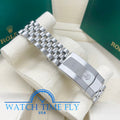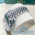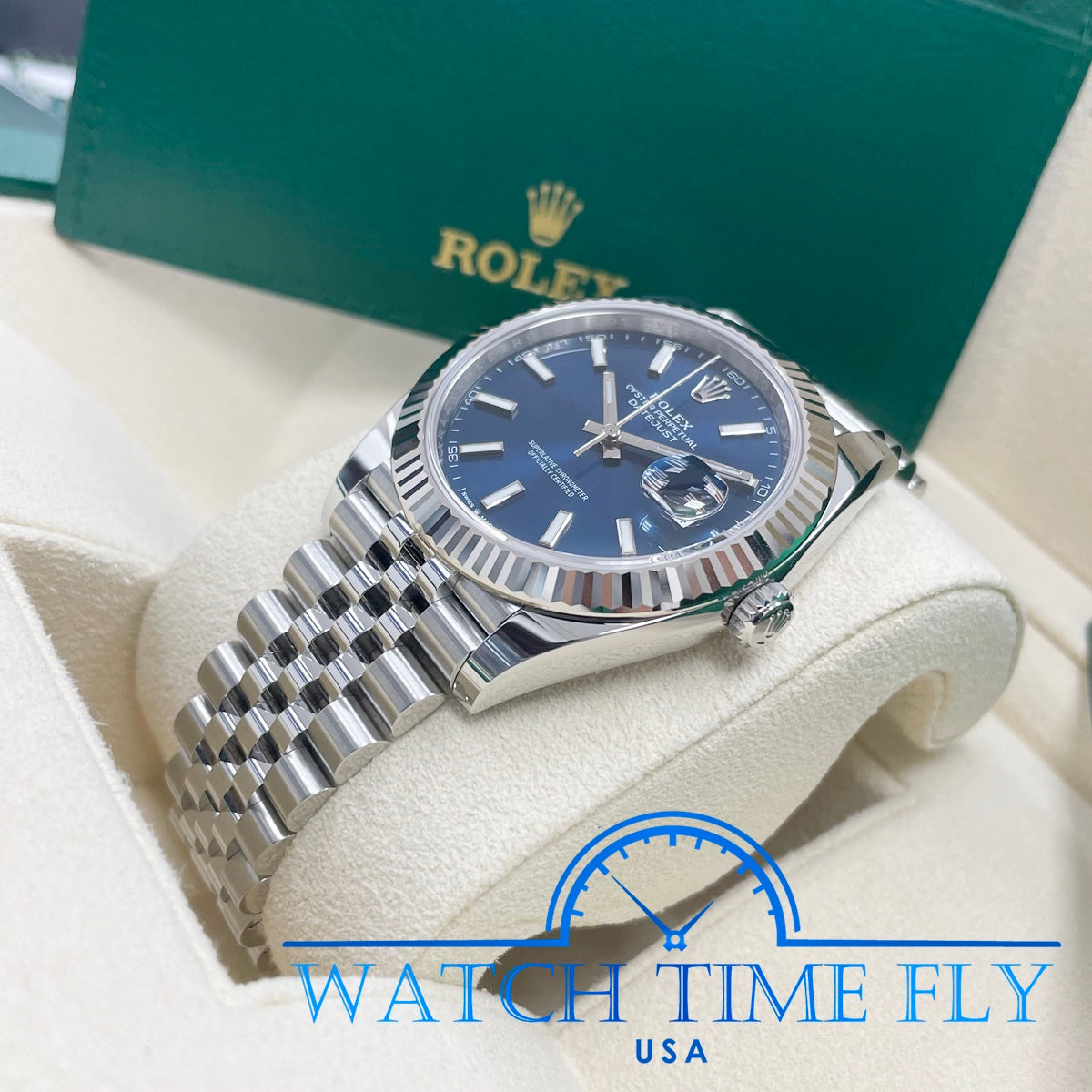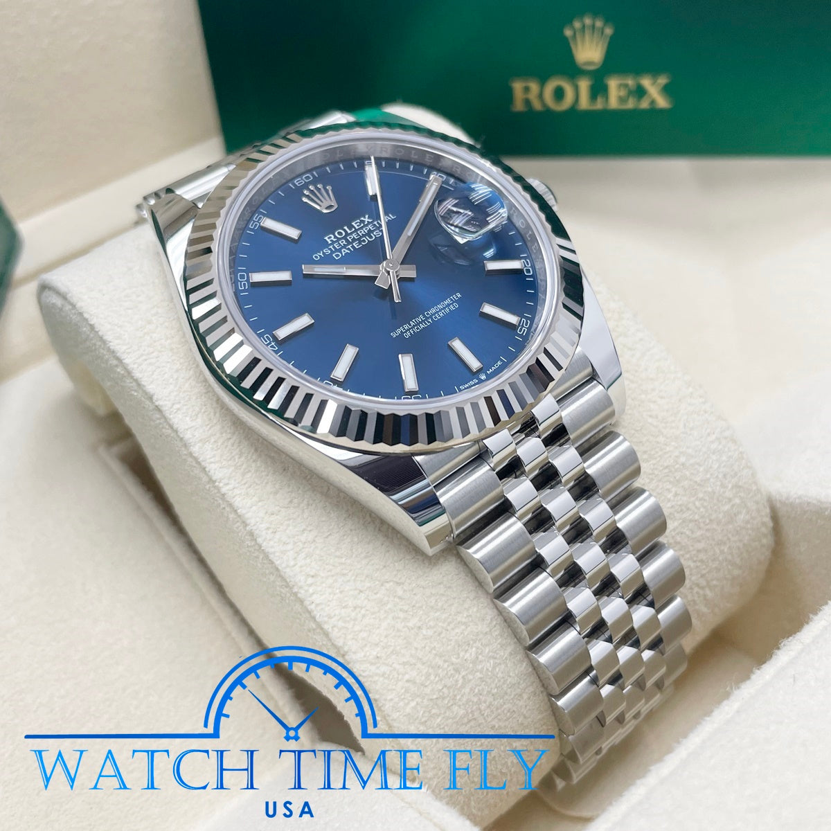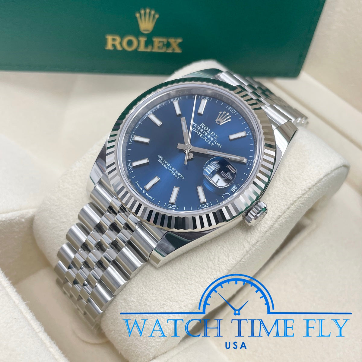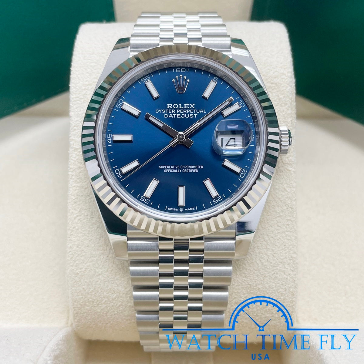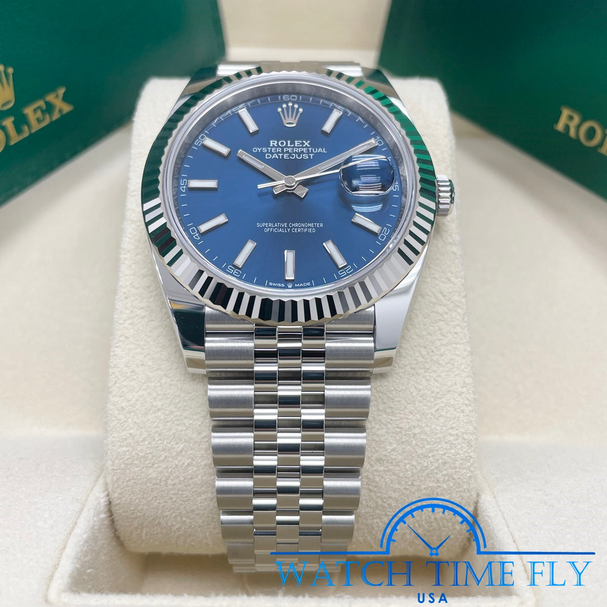 41mm white Rolesor case comprised of a 904L steel monobloc middle case, screw-down steel back, screw-down crown with twinlock double waterproofness system, 18K white gold fluted bezel, scratch-resistant double anti-reflective sapphire crystal with cyclops lens over the date, blue dial, index hour markers, Rolex calibre 3235 perpetual self-winding movement with date at 3 o'clock that changes instantaneously at midnight in a few thousandths of a second, approximately 70 hours of power reserve, 904L steel Jubilee bracelet with five-piece links, folding Oysterclasp buckle with Easylink 5mm comfort extension link. Waterproof to 100 meters.